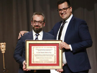 José Antonio Morena Rey, recibiendo la inscripción de recuerdo del pregón, de manos del presidente de la Junta de Hermandades. En el acto se hizo pública la concesión papal de Año Jubilar desde el 9 [Leer Más]