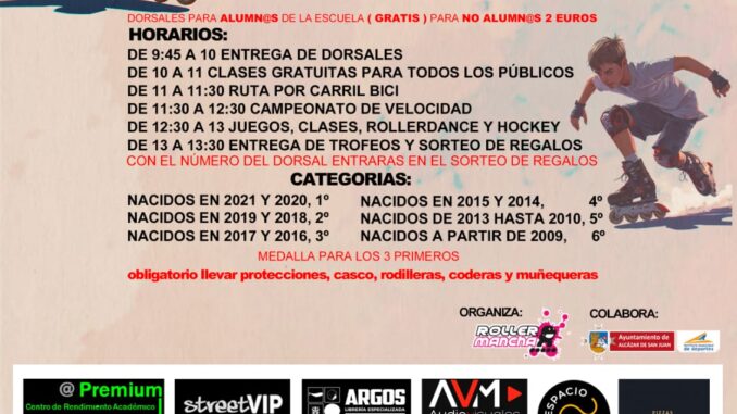 La programación comenzará a las 9:45h con la entrega de dorsales. A partir de las 10:00h se desarrollarán clases gratuitas para todos los públicos, seguidas de una ruta por carril bici a las 11:00h. El campeonato de velocidad dará inicio a las 11:30h, mientras que desde las 12:30h se ofrecerán actividades complementarias como juegos, clases, roller dance y hockey. La jornada concluirá con la entrega de trofeos y un sorteo de regalos a las 13:00h.